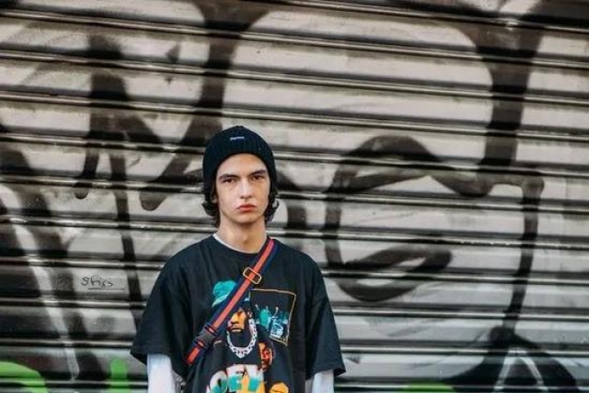 想酷一点的话, 利用大面积的黑色就能实现,比如选择这种撞色外套,下搭黑裤黑鞋对全身进行补充,黑绿look街头风十足。